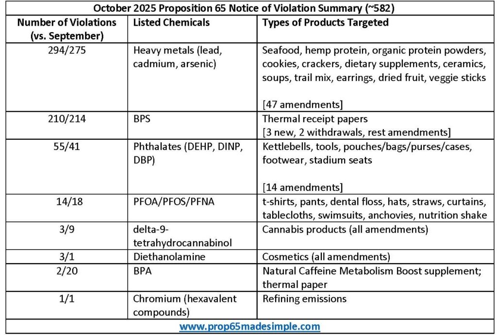 California Proposition 65 is a unique regulation that brings separate compliance requirements from all other regulations in the US (or abroad) and is enforced through civil litigation (via issuance of a Notice of Violation, or “NOV”). A single violation can cost a company upwards of $50,000 or more. At the beginning of each month, we take a quick look at an enforcement summary for the previous month to highlight the types of products being targeted, how frequently, and any new trends in enforcement action that may have appeared.