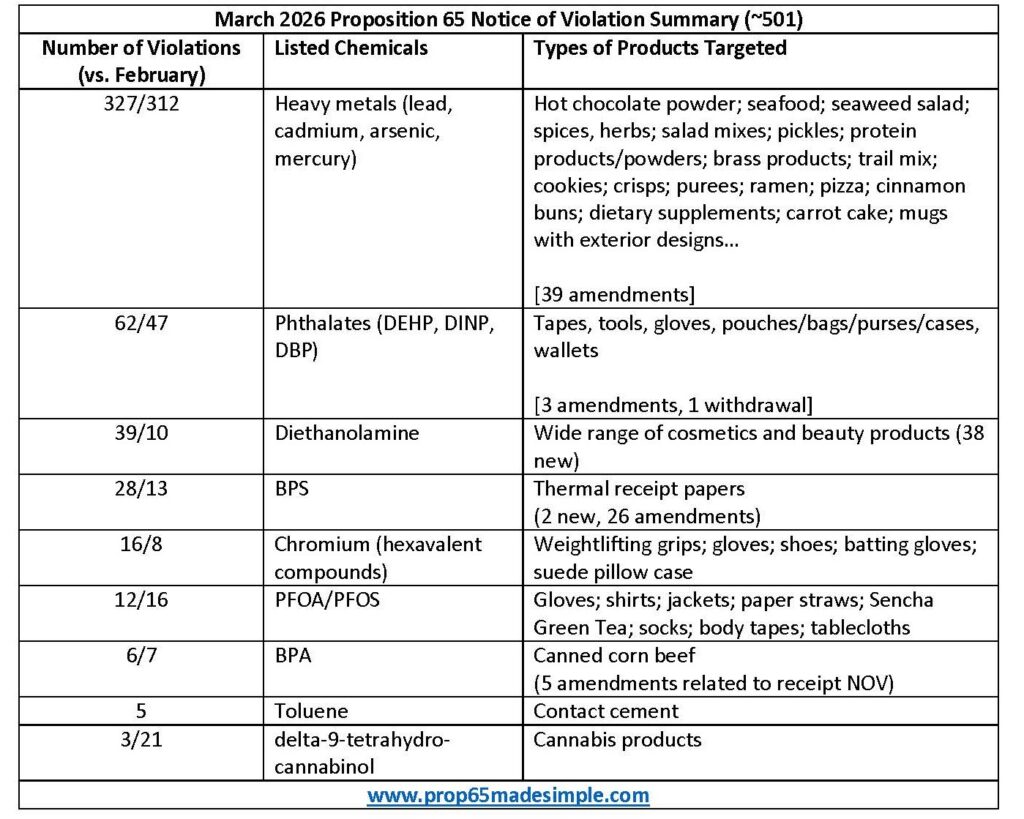 California Proposition 65 is a unique regulation that brings separate compliance requirements from all other regulations in the US (or abroad) and is enforced through civil litigation (via issuance of a Notice of Violation, or “NOV”). A single violation can cost a company upwards of $50,000 or more. At the beginning of each month, we take a quick look at an enforcement summary for the previous month to highlight the types of products being targeted, how frequently, and any new trends in enforcement action that may have appeared.